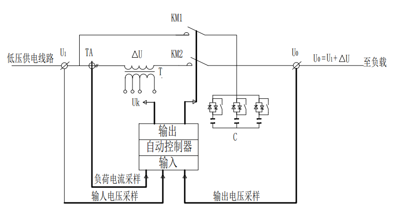 旁路功能;采用晶闸管过零切换,配合继电器旁路,换档快, 损耗低,寿命长,输出无冲击,调压、旁路可手动切换;